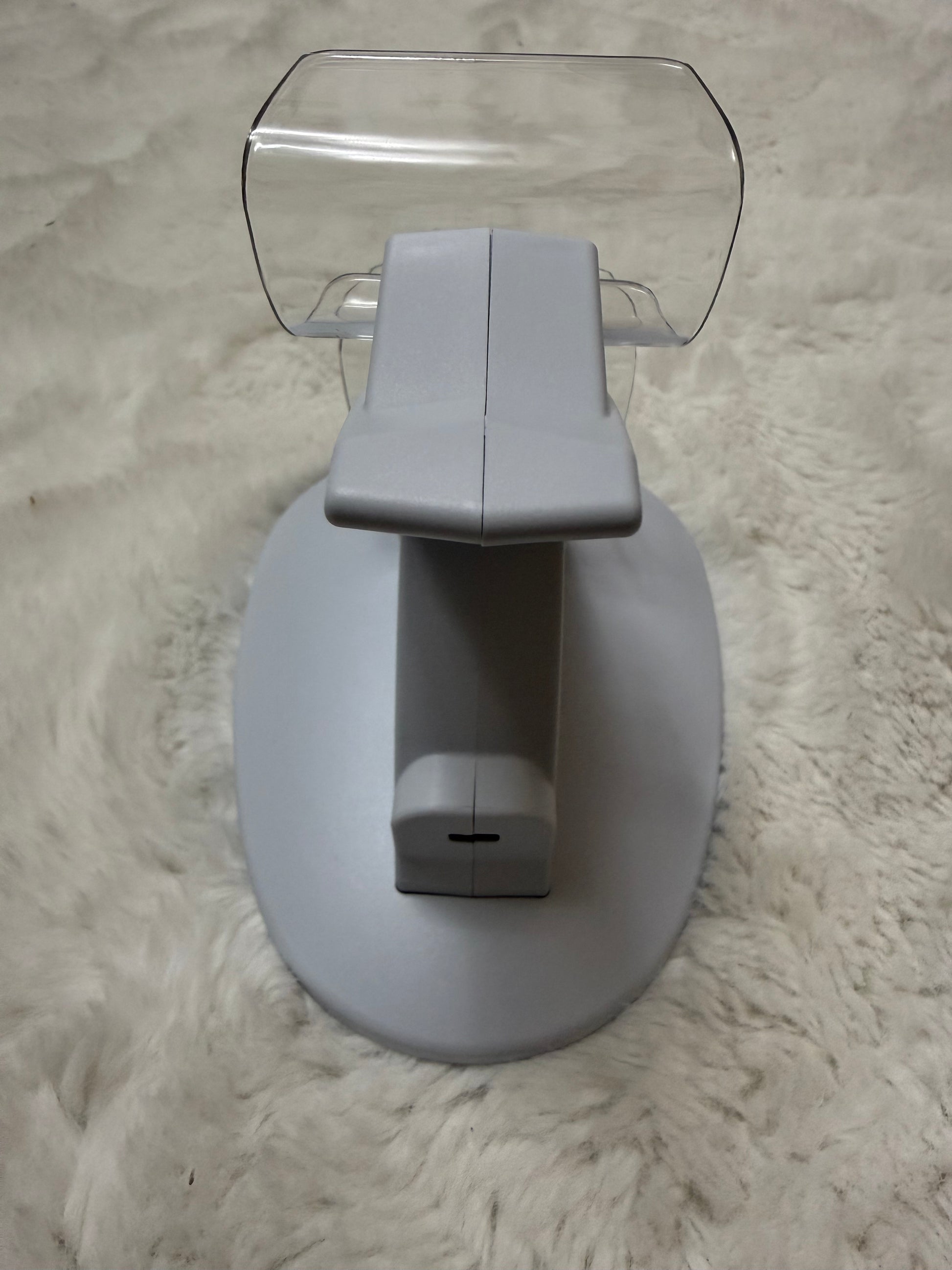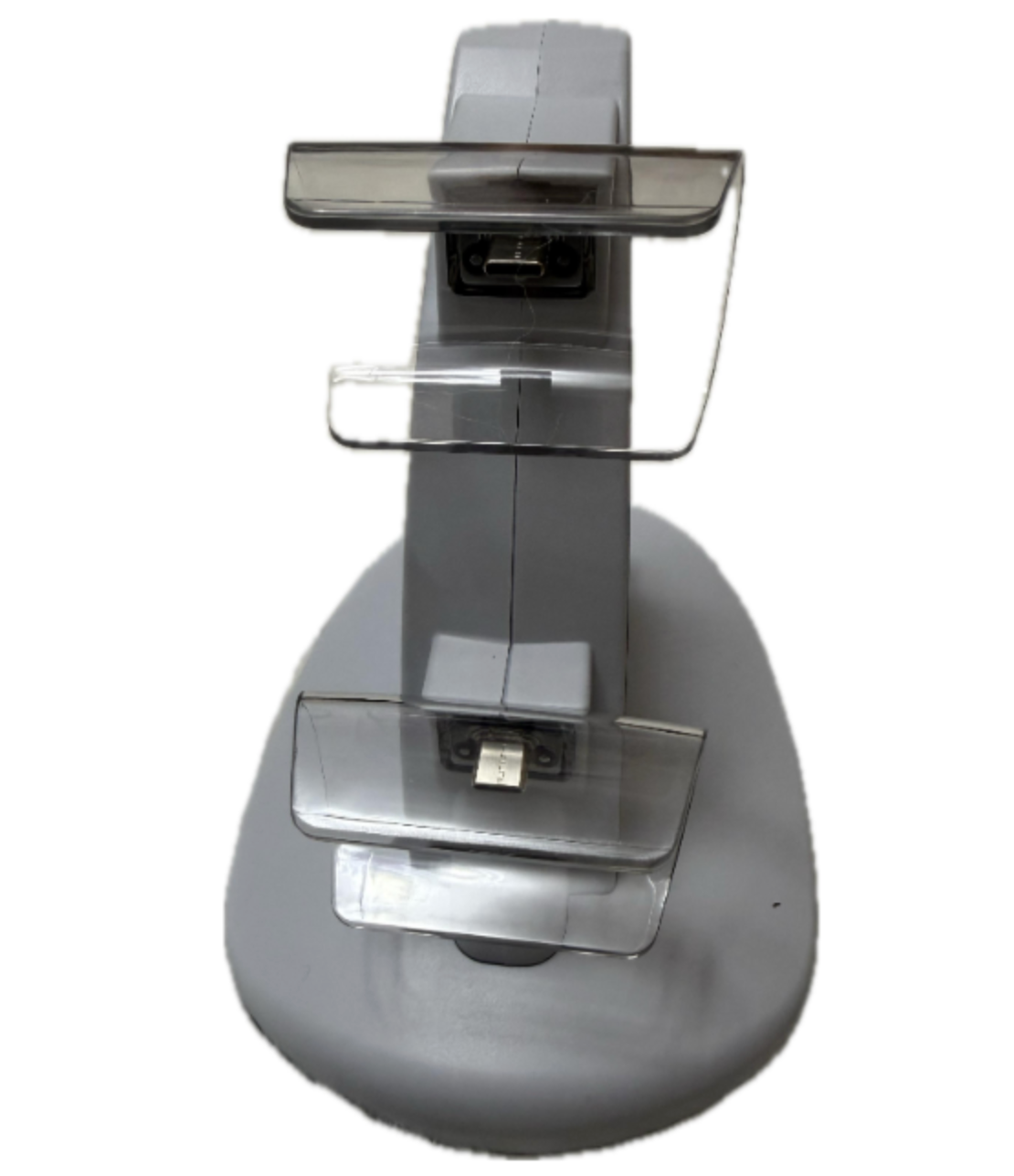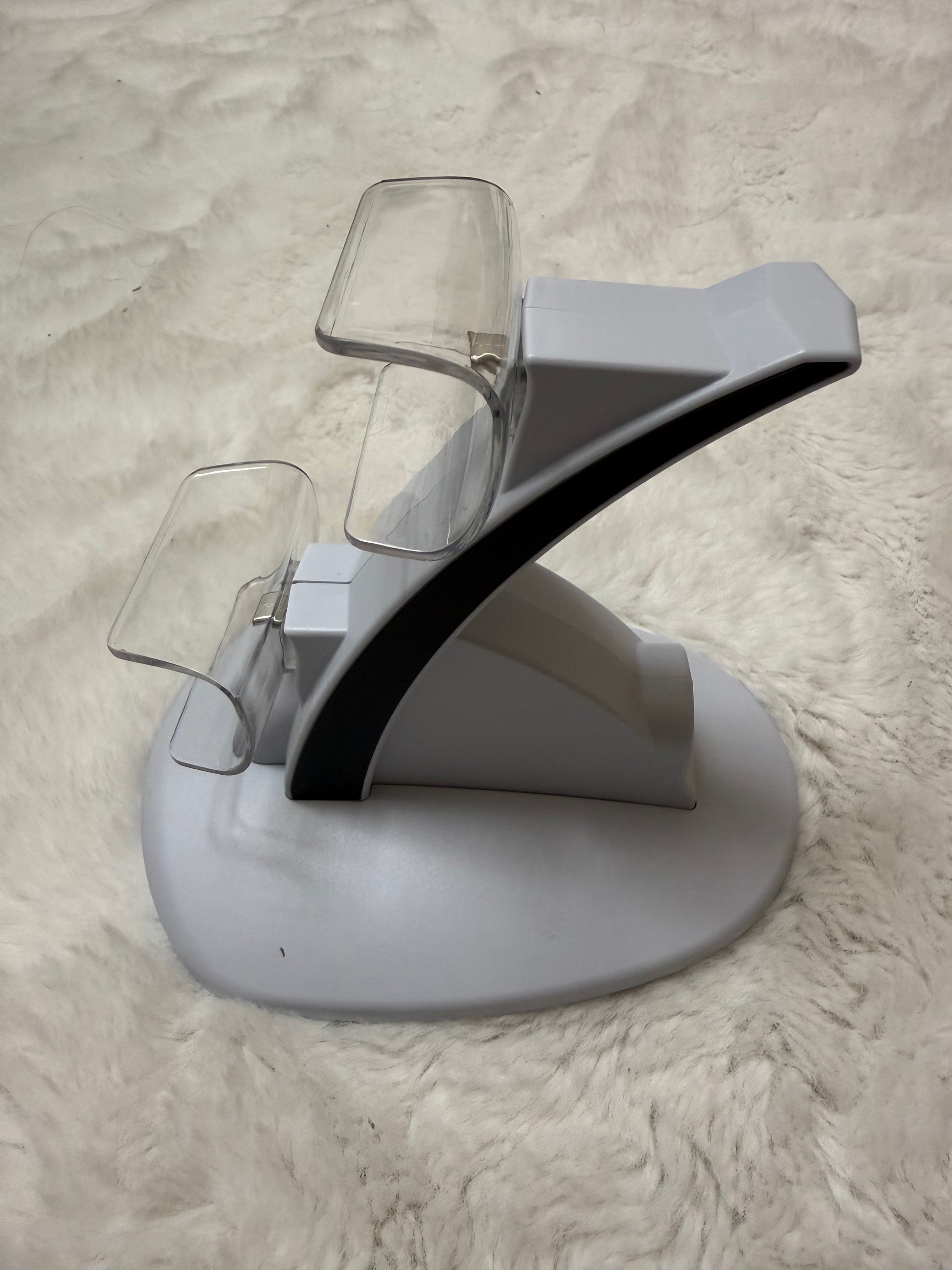 The dock features two charging ports with a stable base, and the clear plastic supports help hold each controller in place safely.